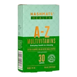 Product DescriptionHashmats Health A-Z Multivitamin 30pack is a complete formulation that provides up to 33 bio-elements per tablet for an active lifestyle with Vitamins, Minerals, Amino Acids & Plant Extracts to supplement the body’s daily nutritional needs. This supplement helps with: Energy Release & Metabolism: Riboflavin, Vitamin B12 & Iron contribute to normal energy & the reduction of tiredness and fatigue. Immune System & Protection: Copper, Vitamin B6 & Vitamin D contribute to maintain the normal function of the immune system. Eyes: Vitamin A & Riboflavin contribute to the maintenance of normal vision. Bones: Vitamin K, Calcium and Zinc contribute to the maintenance of normal bone. Skin & Nails: Vitamin A & Iodine contribute to the maintenance of normal skin. Selenium & Zinc contribute to the maintenance of normal nails. Muscle & Teeth: Vitamin D contributes to the maintenance of normal muscle function and normal teeth. Blood Glucose Levels: Chromium contributes to the maintenance of normal blood glucose levels. Cognitive & Psychological Function: Iron, Iodine & Zinc contribute to normal cognitive function. Vitamin C contributes to normal psychological function. The Hasmats supplement range is Halal & Vegetarian certified. How To UseRecommended for Adults and Children over 12 years of age: Take ONE or TWO tablets per day with your meal. Tablet can be broken in half if needed along the special break-line for easier swallowing. Swallow with water or a cold drink. Not to be chewed. To be taken on a full stomach. |