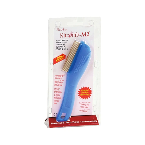 Head lice and lice egg removal comb. Shanty M2 head lice removal comb have patented two row technology. The comb has a row of fine metal teeth closely spaced together and a second row of even closer spaced teeth to maximise on the capture of lice and eggs.
