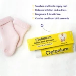 Product DescriptionSoothes and treats your baby’s nappy rash. Metanium Nappy Rash Ointment is a topical ointment, which rubs easily into the skin to treat nappy rash. Soothes and treats your baby’s nappy rash. Metanium nappy rash ointment is a topical ointment which rubs easily into the skin to treat nappy rash. Metanium ointment is specifically formulated to soothe and effectively treat nappy rash. Even the most absorbent nappy leaves some moisture on a baby’s delicate new skin. A baby left in a dirty nappy for too long may also develop nappy rash. Nappy rash can appear on the bottoms of babies with particularly sensitive skin even if the nappy is changed frequently. The most common cause of nappy rash is from micro-organisms in babys faeces coming into contact with urine to produce ammonia. This causes a change in the ph levels of the skin and the resulting irritation which can lead to nappy rash. A babys skin is nearly half as thin as that of adults and therefore more delicate and prone to damage. Metanium ointment is specifically formulated to soothe and effectively treat nappy rash. Metanium ointment is a protective ointment that can be used at every nappy change and especially at bedtime when your baby will not be changed for a while. Metanium ointment rubs easily into the skin and creates a barrier between babys delicate skin and the irritants in urine and faeces helping to treat and prevent nappy rash. IndicationsDo not use Metanium Ointment if your baby is hypersensitive to any of its ingredients. Keep out of the reach and sight of children. Always read the product information leaflet and product packaging before using this product. You must be at least 16 years old to purchase this product. This is a medicine; Consult your doctor or pharmacist if you have an underlying medical condition, are taking any other medication or complementary therapy, or if, symptoms persist. IngredientsActive Ingredients: Titanium Dioxide 20% w/w Titanium Peroxide 5% w/w Titanium Salicylate 3% w/w Also contains: Dimethicone 350, Light Liquid Paraffin, Tincture of Benzoin and White Soft Paraffin DirectionsIt is important that you follow these instructions carefully. After removing the soiled nappy, clean and wash the affected area, drying with a soft towel. After washing your hands, dab a small amount (pea size) of Metanium Ointment over the sore area with your fingertip. It is important to spread this thinly so that the skin texture can be clearly seen through it. Repeat at each nappy change to treat nappy rash. Do not use Metanium Ointment if your baby is hypersensitive to any of its ingredients. Vary rarely Metanium Ointment can cause skin irritation. If any unusual effects occur, discontinue use and consult your pharmacist or doctor. If symptoms persist consult your doctor. Caution: Product may stain fabrics. FOR EXTERNAL USE ONLY. Do not use this product after the expiry date. Safety WarningKeep out of the reach and sight of children. Do not store above 25°C. Soothes and treats your baby’s nappy rash. Metanium nappy rash ointment is a topical ointment which rubs easily into the skin to treat nappy rash. Metanium ointment is specifically formulated to soothe and effectively treat nappy rash. Even the most absorbent nappy leaves some moisture on a baby’s delicate new skin. A baby left in a dirty nappy for too long may also develop nappy rash. Nappy rash can appear on the bottoms of babies with particularly sensitive skin even if the nappy is changed frequently. |