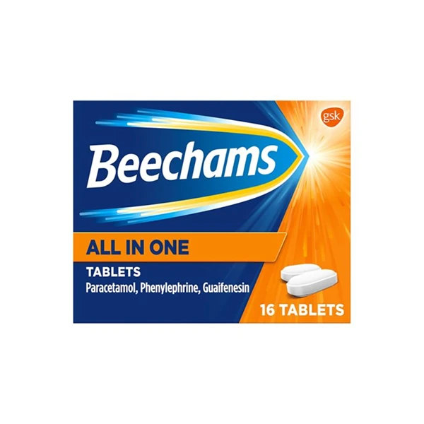 Details:Suitable forAdults and Children aged 12 years and over. Age RestrictionYou must be at least 16 years old to purchase this product. How to useAdults and children aged 12 years and over: Take 2 tablets every four hours as necessary. Do not take more frequently than every 4 hours. Do not take more than 8 tablets in 24 hours. Hazards and CautionsDo not exceed the stated dose. Do not give to children under 12 years of age except on medical advice. Do not take for more than 5 days except on medical advice. Consult your doctor before taking this medicine, if you are under the care of your doctor or receiving prescribed medicines or are pregnant, or suffer from chronic cough or asthma. Contains paracetamol. Do not take with any other paracetamol-containing products. Immediate medical advice should be sought in the event of an overdose, even if you feel well. Do not take with any other flu, cold or decongestant products, or cough suppressants. Do not store above 25° C. Keep out of the reach and sight of children. PrecautionsThis is a medicine; Consult your doctor or pharmacist if you have an underlying medical condition, are taking any other medication or complementary therapy, or if symptoms persist. Seek advice before using if you are breast feeding, pregnant, planning to become pregnant, or suffer from allergies. Keep all medicines out of the reach of children. Active ingredientsEach tablet contains paracetamol 250 mg, guaifenesin 100 mg and phenylephrine hydrochloride 5 mg IngredientsActive Ingredients:Each tablet contains paracetamol 250 mg, guaifenesin 100 mg and phenylephrine hydrochloride 5 mg Other Ingredients:Lactose, microcrystalline cellulose, maize starch, stearic acid, colloidal anhydrous silica, purified talc, povidone, potassium sorbate [E 202], hypromellose, titanium dioxide (E 171) and polyethylene glycol. Beechams Triple Action formula Provides effective relief from: Pain Congestion A chesty cough So that your head can feel clear and focused again Note: This is a medicine, no prolonged use without medical advice, keep away from children, reading the package insert. Ask your doctor or pharmacist. In case of side effects, contact your doctor. |