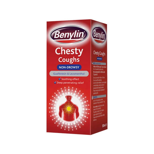 How it works:Active ingredient guaifenesin helps thin and loosen phlegm in your chest, making it easier to cough up. The active ingredient levomenthol also helps to relieve congestion to make it easier to breathe. What is a chesty cough?Chesty coughs are caused by a build-up of phlegm in the lungs and on the chest. The cough mechanism kicks in to try and get rid of this excess phlegm. HOW TO USEFor oral use only. Do not use more than the stated dose shown. Dosage:Adults and children aged 12 years and over: Take two 5 ml spoonfuls every 4 – 6 hours, four times a day Not suitable for children under 12 years Do not take more than 4 doses in 24 hours. If symptoms persist, talk to your doctor or pharmacist BENYLIN Chesty Coughs Non-Drowsy works deep down in the chest to help loosen phlegm, so that when you cough you can actually cough some of the phlegm up. This helps clear bronchial congestion. Note: This is a medicine, no prolonged use without medical advice, keep away from children, reading the package insert. Ask your doctor or pharmacist. In case of side effects, contact your doctor. |
