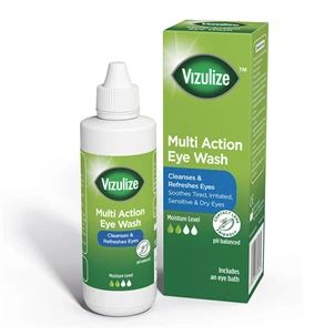 Product Description Vizulize Multi Action Eye Wash has been specially developed to Cleanse & Refresh Eyes and Soothe Tired, Irritated, Sensitive & Dry Eyes. Vizulize Eye Wash includes an easy to use eye bath to aid application. Formulated to be kind to eyes, Vizulize Multi-Action Eye Wash is pH balanced to the eye’s tear fluid to help prevent stinging on application. Ingredients Soft, isotonic solution containing: HPMC, Sodium Edetate 0.01%, PHMB 0.0001%. Directions for use Vizulize Eye Wash is for use in eyes only and can be used without having to remove contact lenses. Ensure your hands are clean and dry before use. To open the bottle, twist the cap anti-clockwise to break the seal. Rinse the eye bath with some eyewash before use. Fill the eye bath with some eyewash until it’s about a third full. Bend your head forward slightly, holding the eye bath by its base. Place the eye bath over your eye. Open your eye whilst slowly raising your head so the wash flows into it. Gently rock your head from side to side for at least 30 seconds. Tilt your head forward again and remove the eye bath, discarding any remaining eyewash. Repeat for the other eye. Storage instructions Keep out of the sight and reach of children. Store between 5◦C and 30◦C. Avoid direct sunlight. |